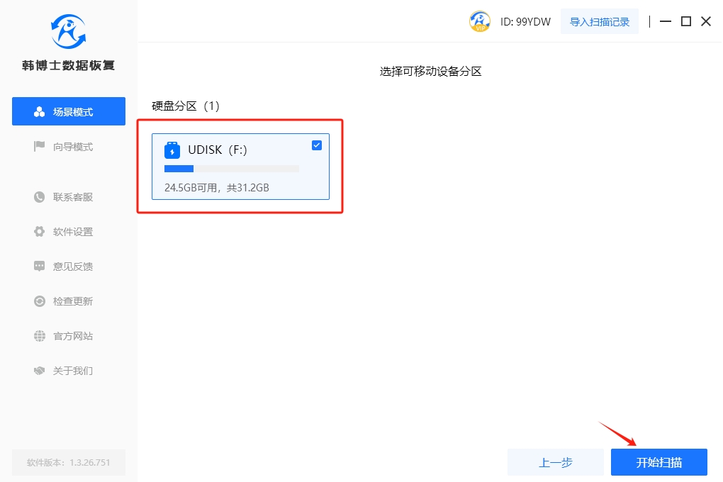 1.雙擊點開韓博士,進入軟件界面,找到“場景模式”,并選擇“U盤/內存卡恢復”,來執行數據恢復的相關步驟。
