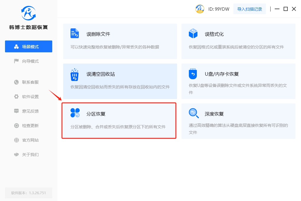 1. 在電腦上提前下載并安裝好韓博士數據恢復,啟動后,選擇“場景模式”下的“分區恢復”,以繼續下一步的數據恢復操作。