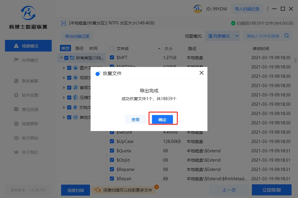 6.點(diǎn)擊“確定”,這是韓博士恢復(fù)硬盤數(shù)據(jù)的最后一步,確保整個(gè)過程被成功恢復(fù)。
