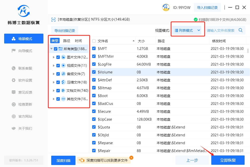 3. 韓博士正在掃描硬盤數據,您不必動手操作,只需耐心等待掃描完畢。等掃描結束后,挑選您需要恢復的文件,然后點一下“立即恢復”,這樣就可以了。