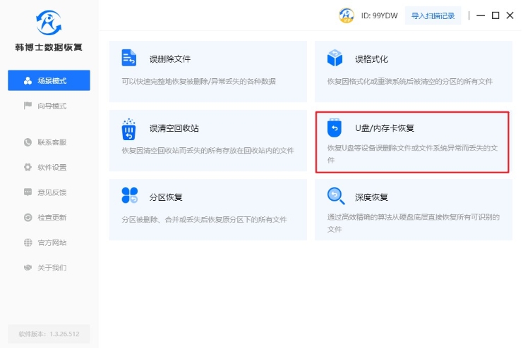 1. 首先,將韓博士數據恢復下載到桌面,并雙擊打開。然后,在“場景模式”下選擇“U盤/內存卡恢復”。