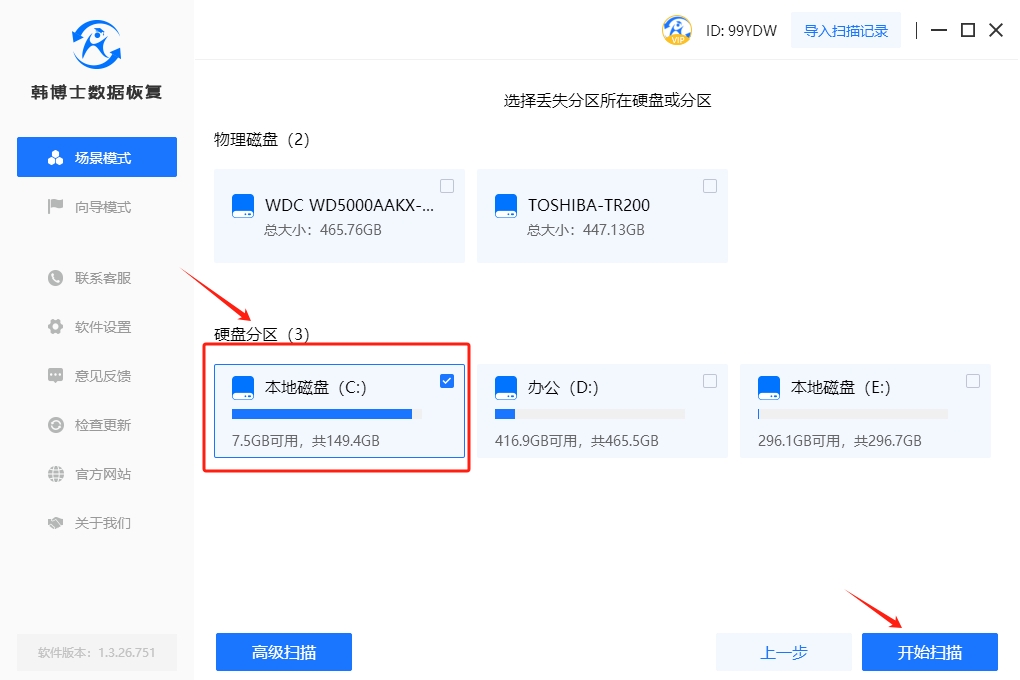 1. 在進行數據恢復之前,請確保您的計算機上已經安裝了韓博士數據恢復軟件。接著雙擊啟動韓博士,在“場景模式”下選擇“分區恢復”,來進行硬盤數據恢復。