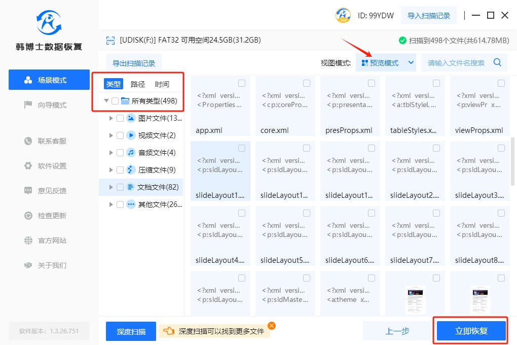 4. 完成掃描后,您可以先點擊“預覽模式”,確認文件是否正確,然后選擇您想要恢復的數據,最后再點擊“立即恢復”。
