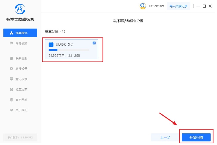 1. 打開韓博士數據數據恢復軟件,這是內存卡數據恢復的必要步驟。然后,在軟件界面中找到“場景模式”,點擊“U盤/內存卡恢復”。
