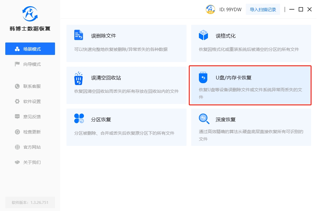 1. 開始恢復前,請先將韓博士數據恢復軟件下載到桌面,并雙擊打開。接著,在界面中找到“場景模式”,然后選擇“U盤/內存卡恢復”。這樣,您就可以開始進行SD卡的數據恢復了。