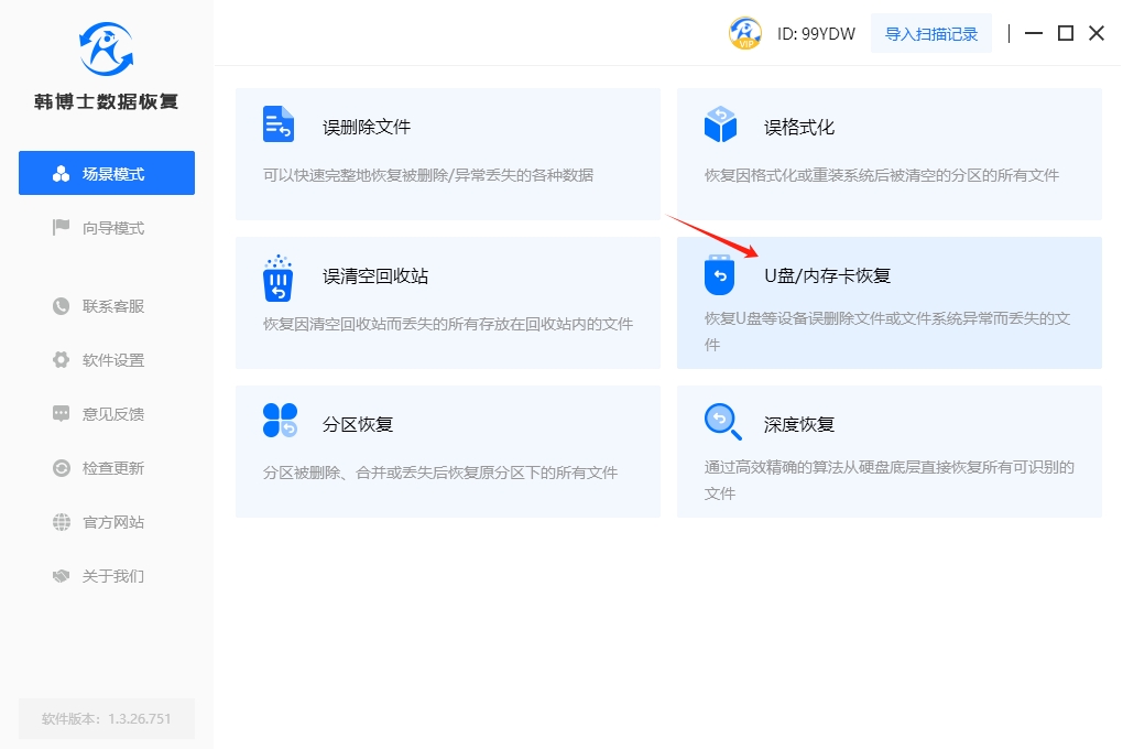1.雙擊點開韓博士,進入軟件界面,找到“場景模式”,并選擇“U盤/內(nèi)存卡恢復(fù)”,來執(zhí)行數(shù)據(jù)恢復(fù)的相關(guān)步驟。