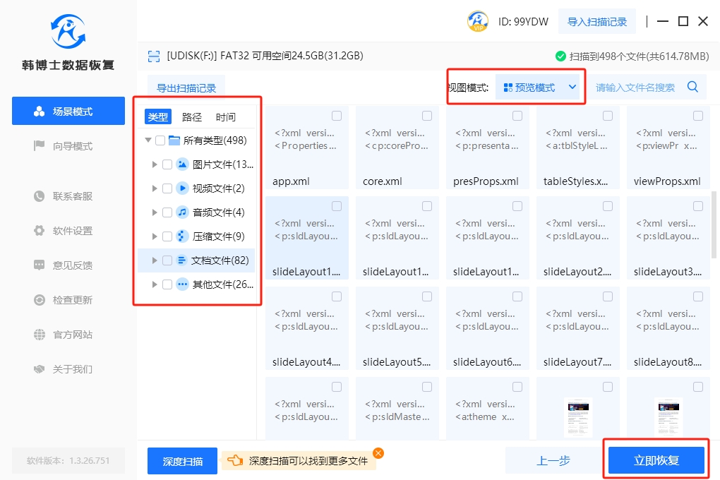 4. 掃描完成后,您可以通過“預覽模式”來確認文件是否正確,接下來選擇需要恢復的文件,選好后再點擊“立即恢復”。