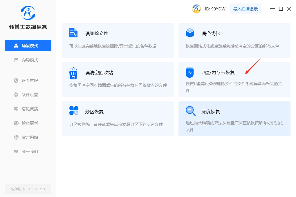 1. 雙擊打開桌面上下載好的韓博士數據恢復,接著在“場景模式”中選擇“U盤/內存卡恢復”,進入文件恢復流程。