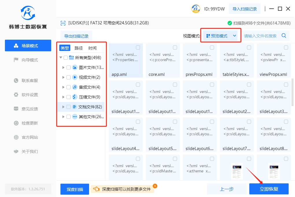4. 完成掃描后,您可以使用“預覽模式”,來驗證文件是否正確,然后挑選需要恢復的文件,選好后再點擊“立即恢復”。