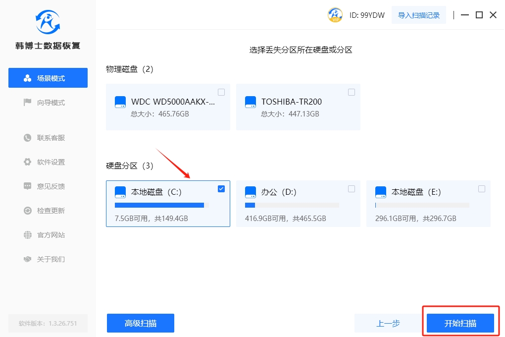 1. 在進入了韓博士數據恢復軟件后,切換到場景模式,選擇“分區恢復”來執行適當的數據恢復任務。