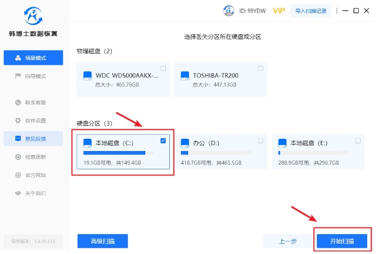 2. 根據(jù)特定的數(shù)據(jù)丟失,請找到硬盤的某個分區(qū),然后單擊“開始掃描”按鈕。