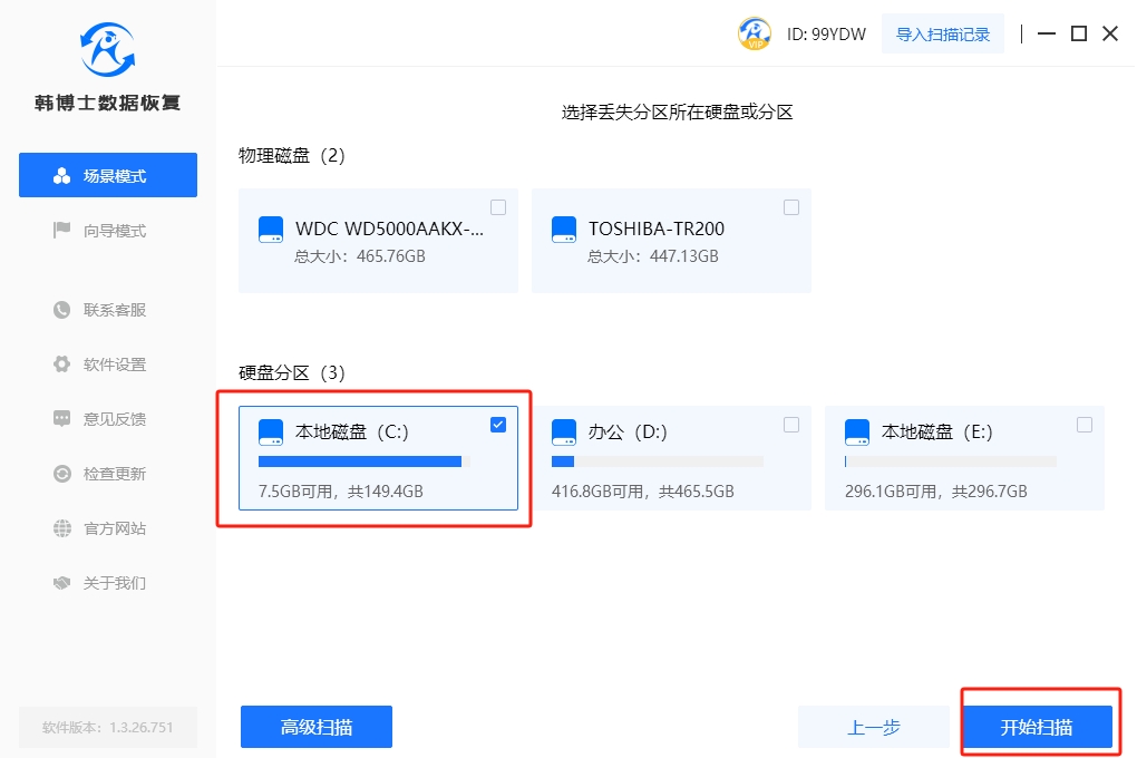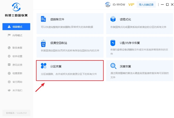 1. 下載并在計算機上安裝好韓博士數據恢復,之后選擇“場景模式”下的“分區恢復”,再繼續下一步的恢復操作。