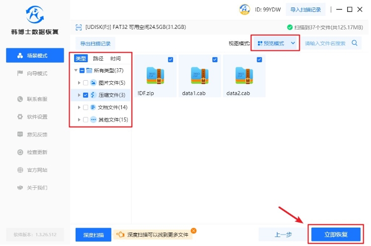 4. 掃描操作結束后,不要忘記點擊“預覽模式”,來檢查文件的準確性。確認文件正確無誤后,選中您想要恢復的文件,然后點擊“立即恢復”。