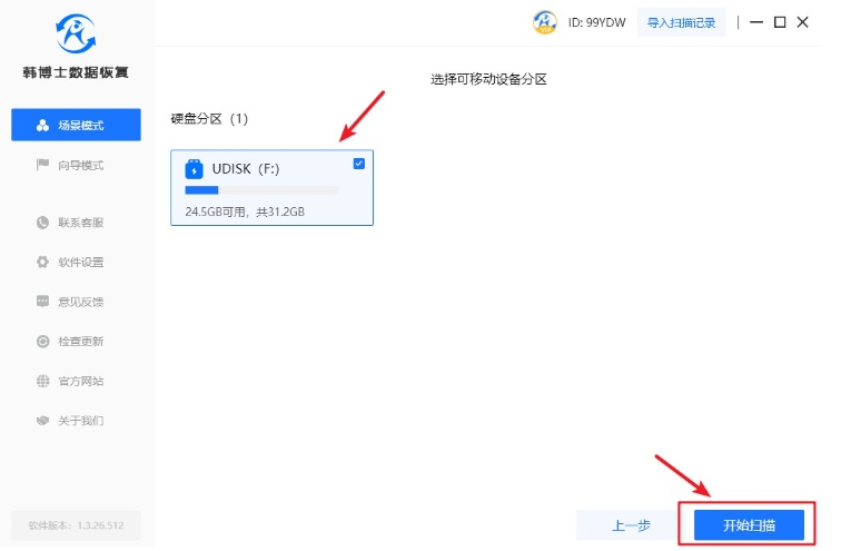 2. 找到并選擇您的U盤,接著點擊“開始掃描”按鈕,開始執行數據掃描操作。
