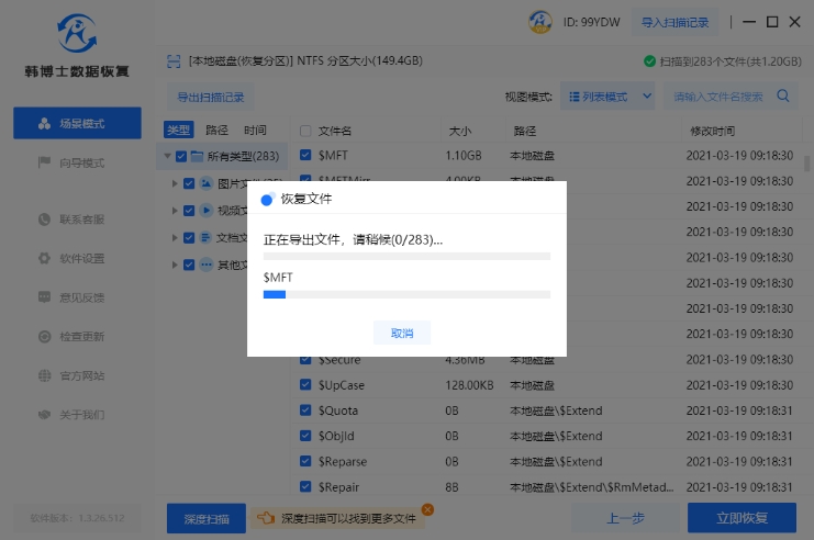 3. 韓博士正在進行文件掃描,請保持耐心等待。掃描完成后,勾選要恢復的文件,然后點擊“立即恢復”按鈕,即可順利完成數據恢復過程。
