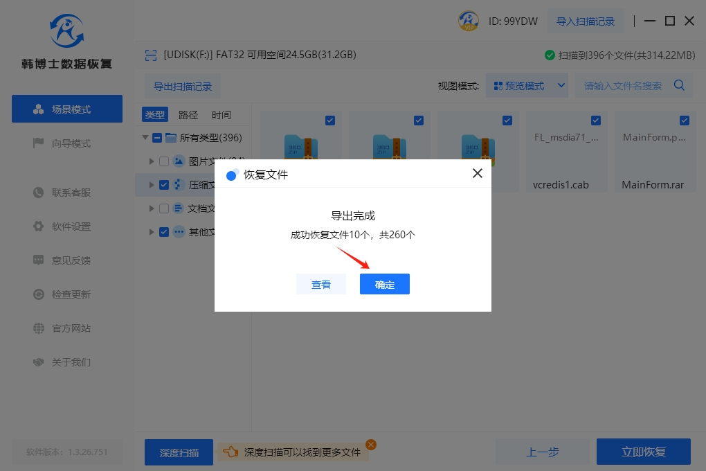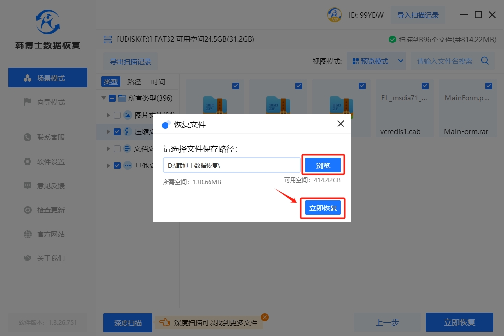 1.首先,打開韓博士數據恢復軟件,這是開始內存卡數據恢復的第一步。接著,在界面上找到“場景模式”,點一下“U盤/內存卡恢復”。