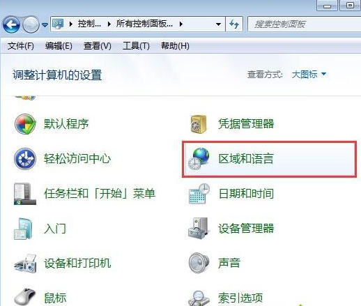 1.打開控制面板并選擇“區域和語言”進入,如圖所示: