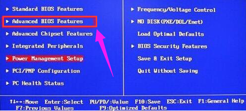 2.開(kāi)始在打開(kāi)的bios界面中使用方向鍵選擇“Advanced BIOS Features”回車進(jìn)入。