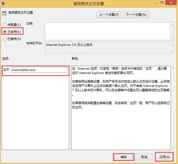 3.在打開的窗口中,直接設置為“已啟用”,在主頁框中輸入想要訪問的網站作為主頁,最后保存設置即可。