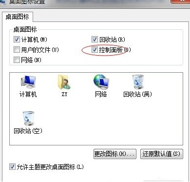 3.在彈出的對話框中勾選想要顯示的桌面圖標,默認有計算機跟回收站。