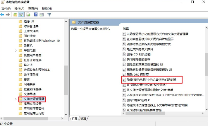 2.打開本地組界面后,直接打開以下選項,隨后雙擊打開“隱藏我的電腦中的這些指定的驅動器”。