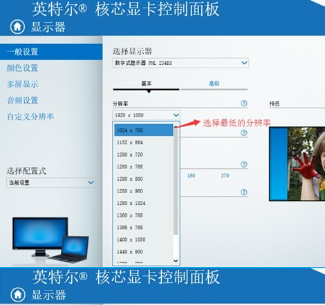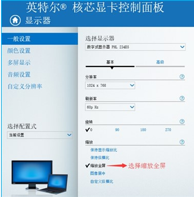 2.點擊“顯示器”,選擇“一般設置”,將“分辨率”調至最低,然后“縮放全屏”。