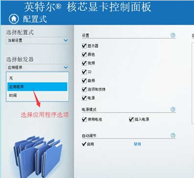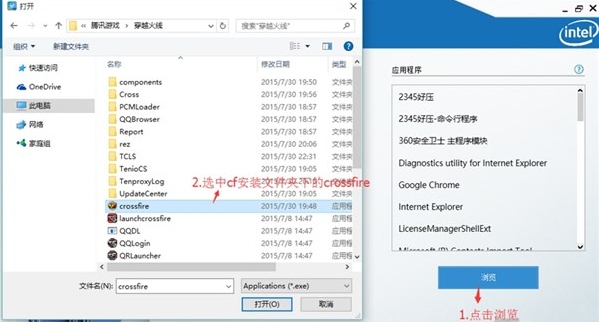 3.退到“控制面板”,點擊“配置式”,選擇“應用程序”,然后選中cf安裝文件夾下的“crossfire”,點擊瀏覽后保存。
