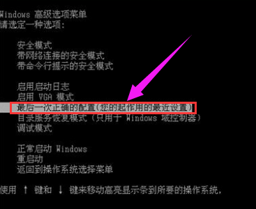 重啟系統,在出現啟動菜單時按下F8鍵高級啟動選項菜單,選擇“最后一次正確配置”,恢復電腦的正確配置。