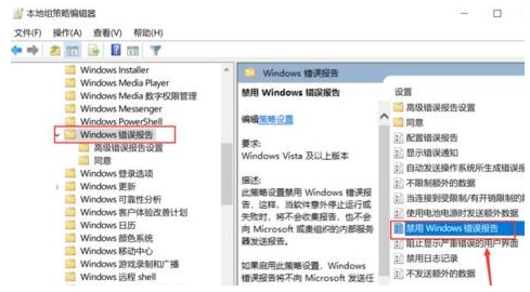 4. 打開windows組件,找到“windows錯誤報告”,再點擊“禁用windows錯誤報告”。
