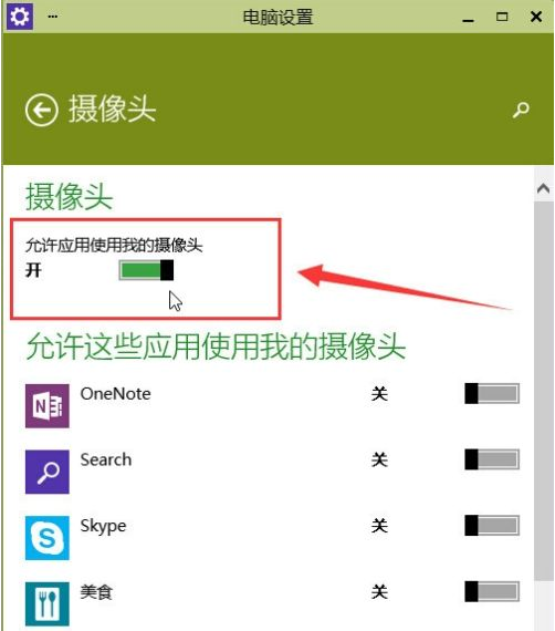 3.在頁面中找到“攝像頭”并打開。