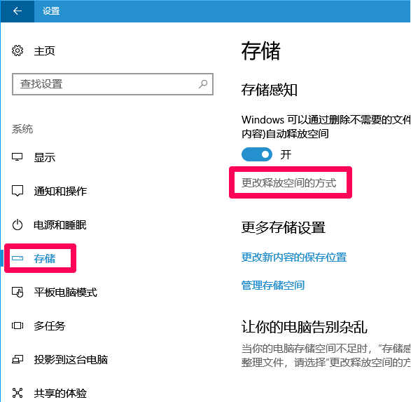 3. 點擊左側的【存儲】,在對應右側窗口中點擊【更改釋放空間的方式】。