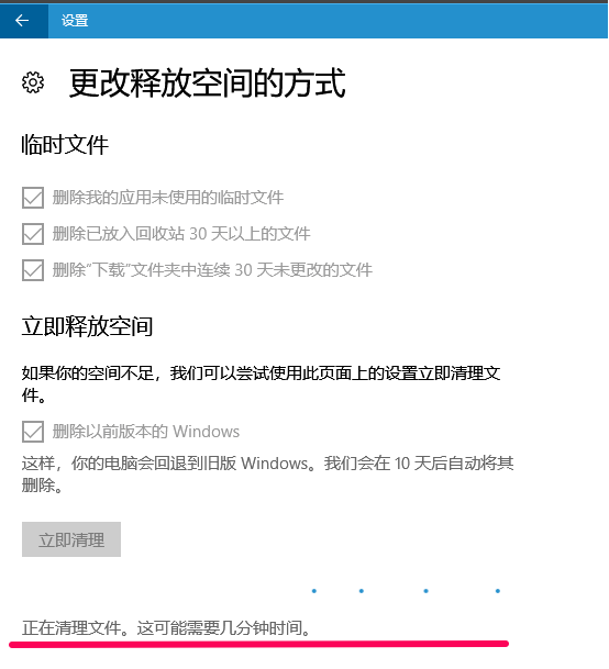 勾選:“刪除“下載”文件中連續30天未更改的文件”、“刪除以前版本的Windows”。最后點擊“立即清理”。