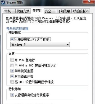打開steam,鼠標右擊選擇“屬性”,點擊“兼容性”,勾選“以兼容模式運行這個程序”、“禁用視覺主題”、“禁用桌面元素”和“以管理員身份運行此程序”。