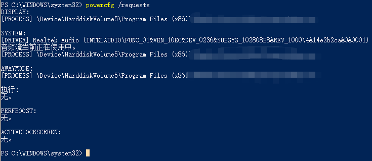 2.在新窗口界面輸入:powercfg -requests枚舉應用程序和驅動程序電源請求,查詢導致額外的電源狀態的程序。若有程序影響,此時程序將會羅列所有影響的程序的具體路徑;如果能確認是什么程序,直接結束運行即可;如果不確定是什么程序,可以到對應路徑的文件夾確認是什么程序然后關閉。