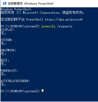3. 若關閉了所有羅列的特殊電源請求的程序后,可以再運行一次命令。如果還有羅列程序,重復上一步操作,繼續關閉所有影響的程序;如果顯示為下圖,沒有影響的程序,那么可以直接關閉Windows PowerShell窗口,重新嘗試鎖屏看看屏幕是否能在離開一定時間后正常息屏。