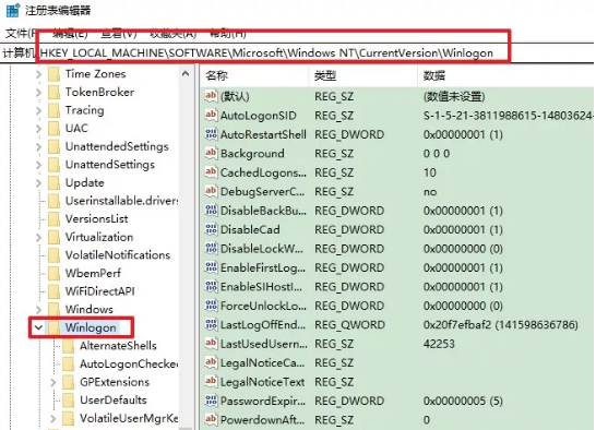 2.依次展開注冊表至:HKEY_LOCAL_MACHINE/SOFTWARE/Microsoft/Windows NT/CurrentVersion/Winlogon。
