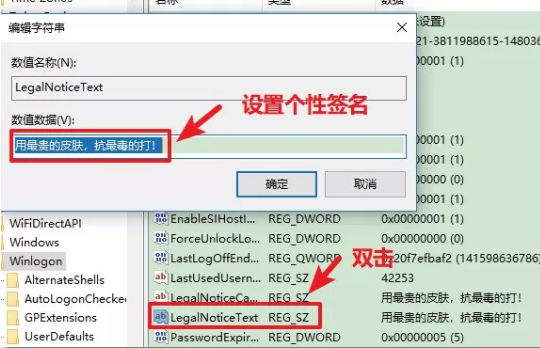 3.在右側分別雙擊【LegalNoticeCaption】和【LegalNoticeText】的兩個文件,把想要顯示在Windows登錄界面的文字依次填寫在【數值數據】中即可。