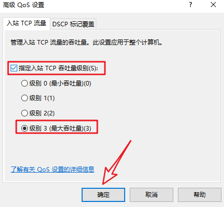 3.勾選『指定人站TCP 吞吐量級別』選擇『級別3』點擊『確定』。