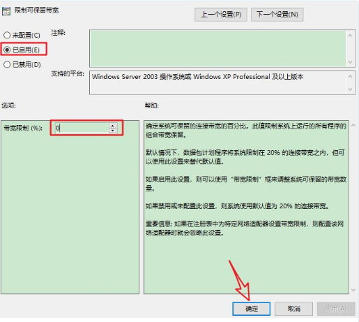 6.勾選『已啟用』,寬帶限制輸入“0”點擊『確定』。