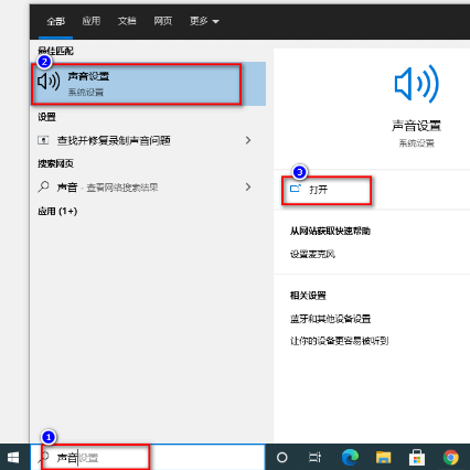 1.通過“聲音設(shè)置”,單獨給不同的軟件應(yīng)用設(shè)置音量、不同的輸出設(shè)備。在搜索框輸入“音量”,“聲音設(shè)置”,“打開”。