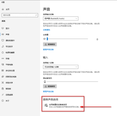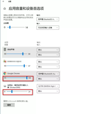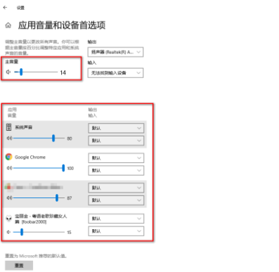 3.在“應(yīng)用音量和設(shè)備首選項”界面,設(shè)置主音量、輸入輸出設(shè)備,也可以單獨給某個軟件應(yīng)用設(shè)置輸入輸出設(shè)備、調(diào)整音量等。