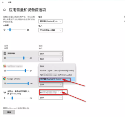 4.點擊Google Chrome后面“默認(rèn)”文本框的下拉符號,選擇揚(yáng)聲器(音響),然后同樣的給footbar2000選擇另外一個Q2000(耳機(jī))的輸出設(shè)備。