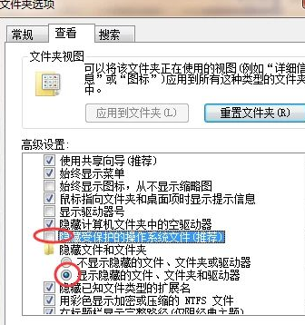 3.取消勾選“隱藏受保護的操作系統文件”,點擊“顯示隱藏的文件、文件夾和驅動器”小圓點。點擊確定后,就會顯示出之前隱藏的文件。
