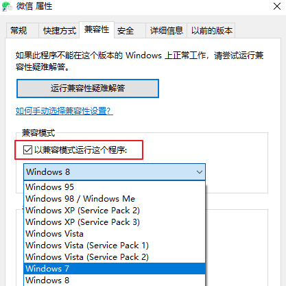 3、勾選“以兼容模式運(yùn)行這個(gè)程序”,然后自行挑選需要的兼容模式,比如Windows7。