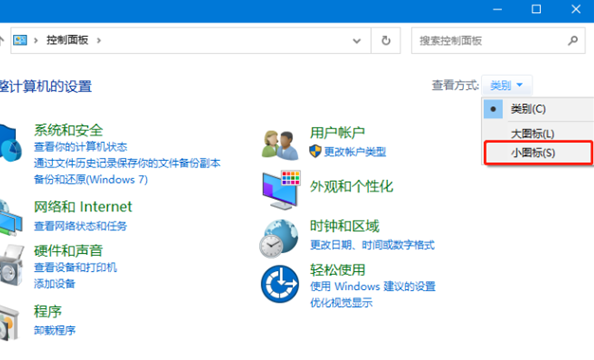 1、打開控制面板,修改查看方式為“小圖標(biāo)”。