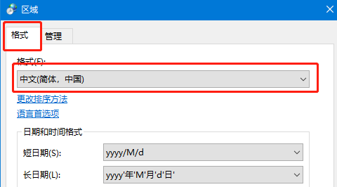 2、選擇“區(qū)域”打開后,在“格式”菜單下,將格式內(nèi)容設(shè)置為“中文(簡體,中國)”。