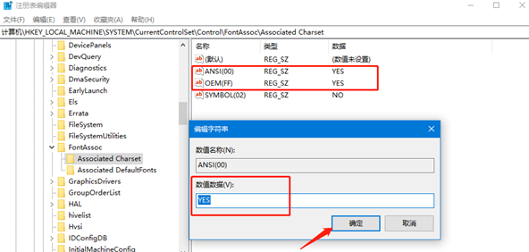 在右側(cè)可以看到“ANSI(00)”和“OEM(FF)”,將它們的數(shù)值都修改為“YES”,再點(diǎn)擊“確定”。
