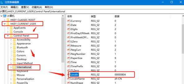 如果方法二還是沒有解決亂碼的問題,則繼續(xù)根據(jù)下圖的路徑,找到locale并且將其數(shù)值數(shù)據(jù)修改為00000804即可。