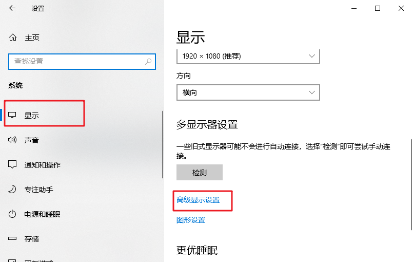 3、在左側欄選擇“顯示”,然后在右側界面找到并點擊“高級顯示設置”。