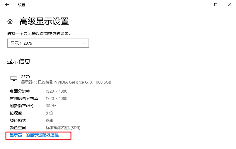 4、下拉高級設置界面,點擊打開“顯示適配器屬性”,之后我們在打開的界面就可以看到顯卡的顯存了。